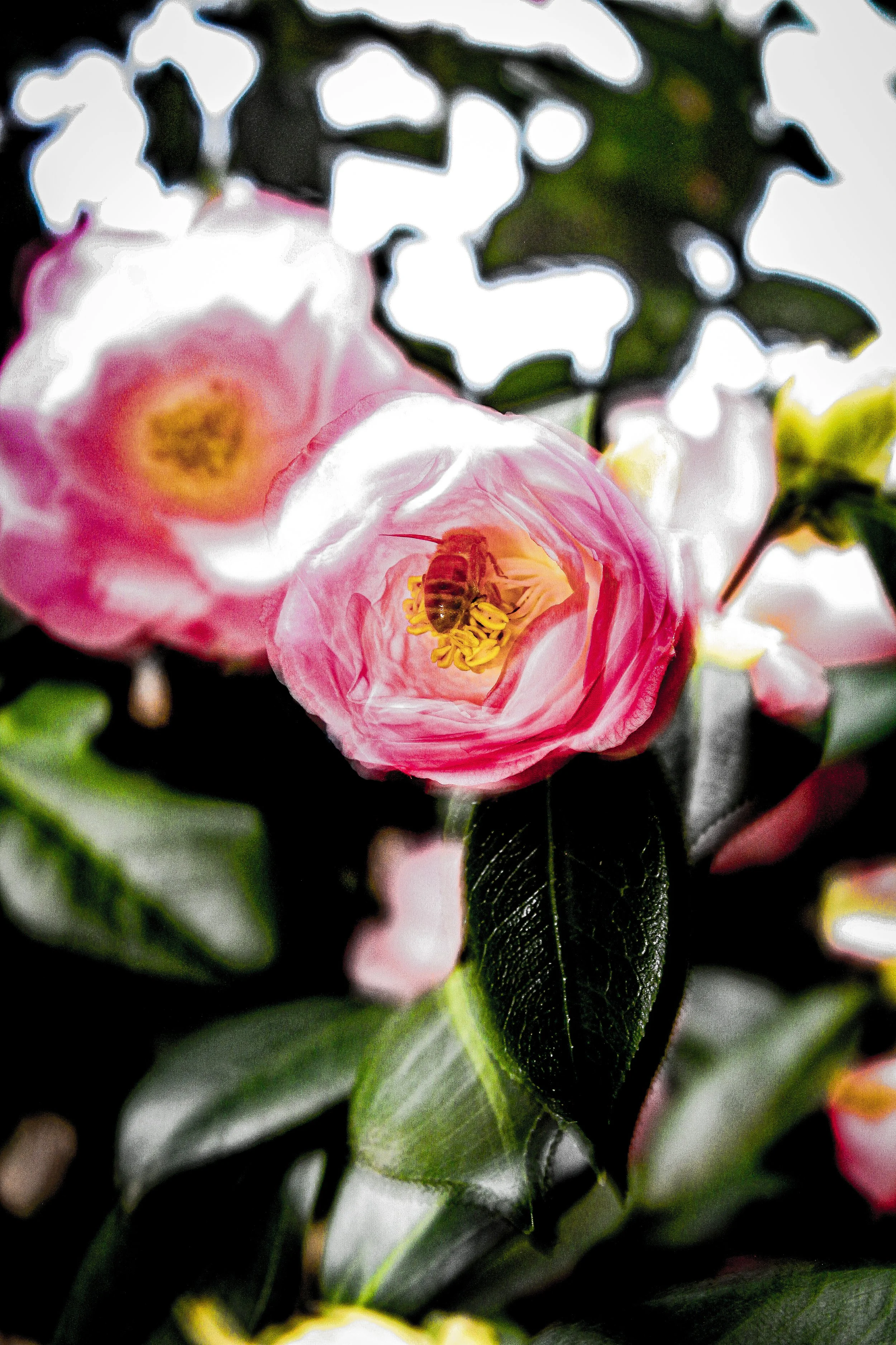 A close-up of pink and white camellia flowers with a bee collecting pollen, surrounded by dark green leaves.